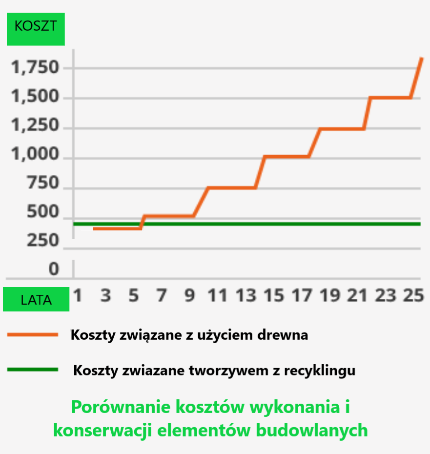 Niestety w perspektywie czasu tak nie jest. Nawet jeśli na początku różnica to kilka % na korzyść drewna to z każdym miesiącem i rokiem koszty konserwacji i wymiany drewna rosną a nasze tworzywo raz użyte nie potrzebuje więcej żadnych dodatkowych prac.