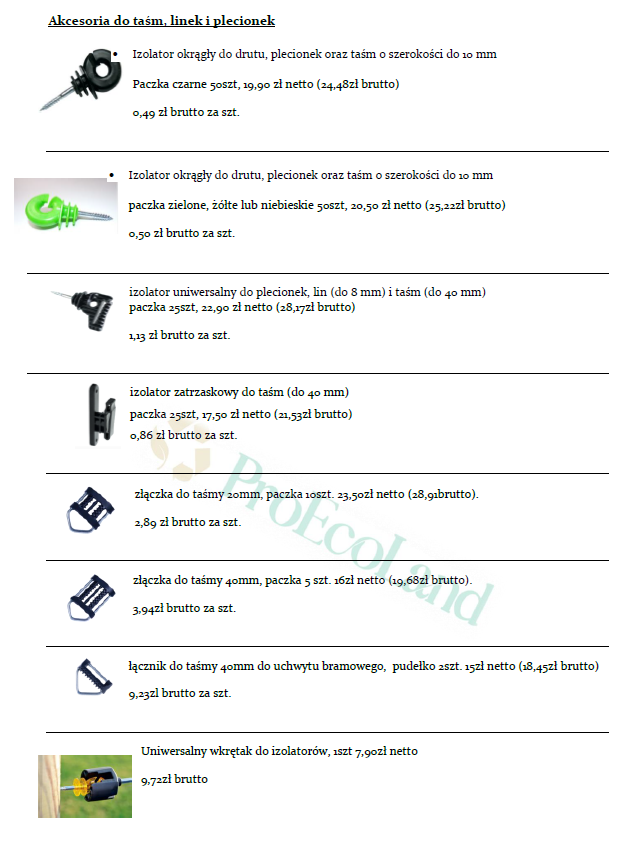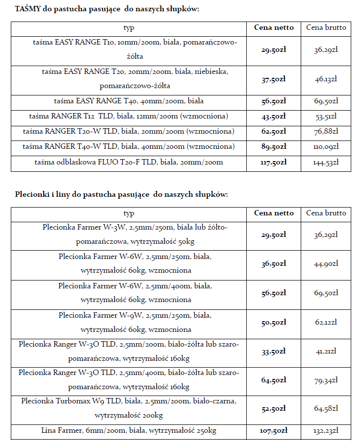 Można zakupić nie tylko nasze słupki ale pasujące do nich taśmy, plecionki i linki oraz akcesoria (izolatory)
